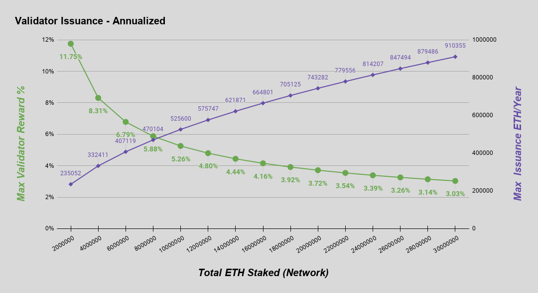 *Assuming validators are online 100% of the time and behaving optimally. Suboptimal validator behavior will lead to reduced rewards and/or penalties that reduce total issuance.